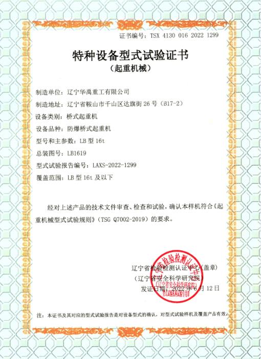 防爆單梁形式試驗(yàn)合格證